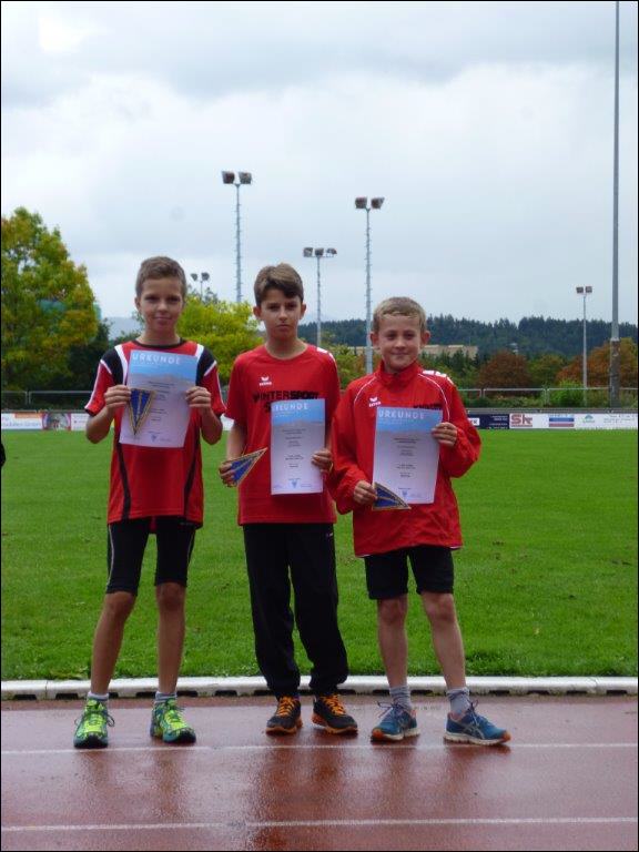 Bereits Robin konnte als Starläufer einen ansehnlichen Vorsprung herauslaufen, den Tizian nach dem Stabwechsel bravourös verteidigte und damit Jonas als Ersten auf die beiden Schlußrunden schickte. Jonas ließ nun gar nichts „anbrennen“ vergrößerte den Vorsprung weiter und lief als Erster, deutlich vor dem Schlußläufer des PSV Konstanz über die Ziellinie. In der ausgezeichneten Gesamtzeit von 8:31,81 Minuten wurde das Trio Regionalmeister.