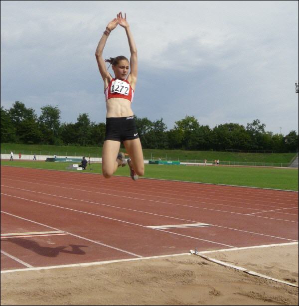 In Anlehnung an die Traingsschwerpunkte der letzten Wochen entschieden sich Mara und ihr mitgereister Trainer, Wolfgang Nitschke, für eine Teilnahme im Weitsprung, im 80 Meter Hürdenlaufen und im 100 Meter Sprint. Für alle drei Disziplinen hatte sich die junge Schwenningerin durch sehr gute Vorergebnisse qualifiziert. Vor allem im Weitsprung galt Mara als Topfavoritin auf den Titel. Hier führte sie mit 5,43 Metern die Württembergische Schülerbestenliste an. Mit dem Weitsprung stieg Mara auch in die Landesmeisterschaften ein. Mit Sprüngen über fünf Meter setzte sie sich bereits von Beginn an, an die Spitze des großen Teilnehmerfeldes. Im fünften Versuch, gelang Mara dann ein Riesensatz. Sie traf das Brett optimal und landete unter großem Beifall der Zuschauer nach 5,62 Metern in der Sandgrube. Die Weite bedeutete nicht nur den souveränen Meistertitel, sondern stellt gleichzeitig eine neue Württembergische Jahresbestleistung dar.